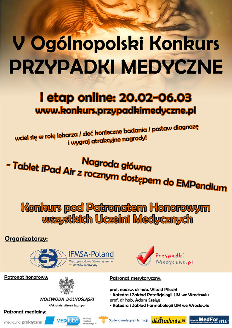 Napisano 3 Marzec 201412 l comment_29123 I etap online 20.02-06.03.2014 (ogólnodostępny) Zostały ostatnie 4 dni pierwszego etapu „V Ogólnopolskiego Konkursu Przypadki Medyczne”. To ostatnia szansa aby wcielić się w rolę lekarza, zlecić badania, postawić diagnozę i wygrać tablet Apple iPad Air i nie tylko. Konkurs jest objęty patronatem honorowym Rektorów wszystkich uczelni medycznych w Polsce, Prezesa Naczelnej Izby Lekarskiej, Wojewody Dolnośląskiego! Zapraszamy do rozwiązywania zadań: http://przypadkimedyczne.pl/konkursy/konkurs-przypadki-medyczne.html Redakcja, PrzypadkiMedyczne.pl Zgłoszenie